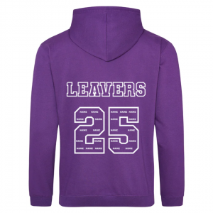 Purple Poly/Cotton Hoodie School logo embroidered on left chest. Leavers 25 and class names on reverse If you would like to add your child's name or initials to the hoodie. Please add these to the comments section of you order.